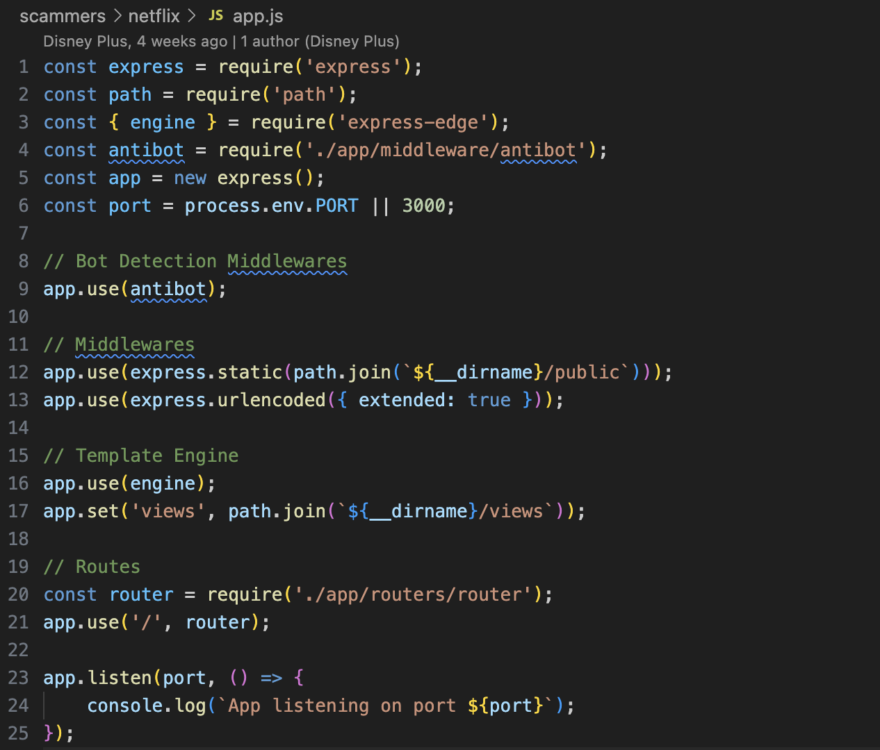 Suspiciously authored by a git user with the name Disney Plus, there is something interesting in the app.js file.